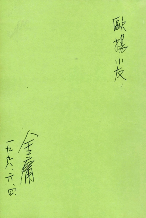 當我將金庸簽名的《鹿鼎記》送回給兒子時,他迫不及待地翻開書的扉頁,只見上面寫著:「歐揚小友」。下麵簽名:「金庸 一九九八年六月四日」。