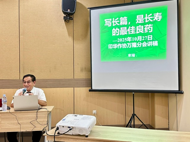 二〇二五年十月廿五日上午在楠榜的印華作協中秋聯歡上午講座會上講題自選,我的題目是「鍵上舞 半世紀」,主要是以自己的業餘創作為例,鼓勵大家多寫作。是日還有新馬的兩位博士的演講。酒店的二樓大堂螢幕不小,場地也夠大,臺下座位的排法是宴會模式,一席一席的,坐得不夠集中,這有點可惜;聽眾約有八十幾至一百人。電腦在舞臺的右側,距離舞臺講者的座位非常遠,我還是靠文友協助操控完成,配合的節奏總算可以吧。