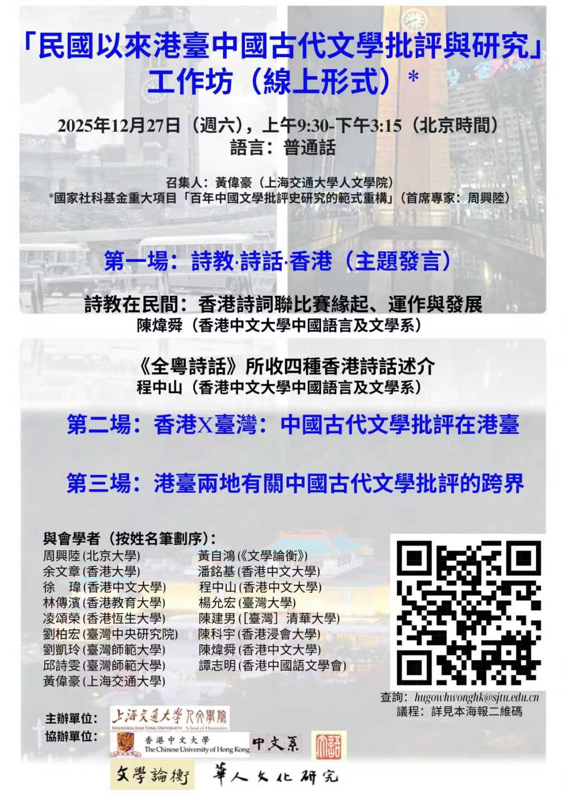 民國以來港臺中國古代文學批評與研究工作坊(12月27日線上)