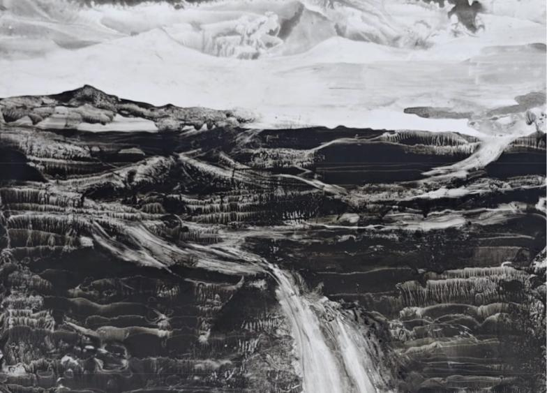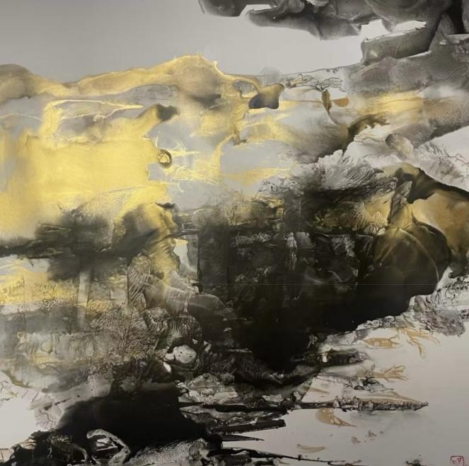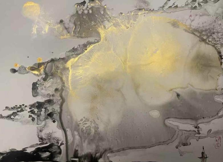 《彼岸系列》最見藝術功力,堪稱印象水墨語言的凝練與昇華。作品尺幅雖小,卻無絲毫局促逼仄之感,淋漓墨韻是其骨血,獨特肌理為其神貌——水墨在宣紙上自然暈染、層層積澱、肆意衝撞,濃淡乾濕的微妙變化裏,勾勒出山石嶙峋、雲水浩渺之態,掙脫了具體物象的拘囿,卻處處透著天地洪荒的磅礴意象。這正是「咫尺之內造乾坤」的東方美學智慧,她以「虛」寫「實」,以「簡」馭「繁」,讓筆墨徹底脫離形體的束縛,直抵精神層面的彼岸。其肌理之妙更是可圈可點,時而如皴擦的蒼勁古樸,時而為濕墨洇染的氤氳朦朧,似歲月剝蝕留下的斑駁痕跡,又似心潮流動的無形印記,讓畫面兼具水墨的溫潤通透與力量的沉潛內斂。觀畫者可細品墨色層次的千變萬化,於筆觸起落間窺見創作者的心境起伏;亦可遐觀天地遼闊的精神圖景,在留白之處尋得靈魂安放的歸處。這片彼岸,是詩人心中超脫世俗的精神原鄉,無需具象描摹,只在墨韻流轉之間,便帶領觀者與畫者共赴一場心靈遠行,完美契合東方美學「言有盡而意無窮」的至高境界。