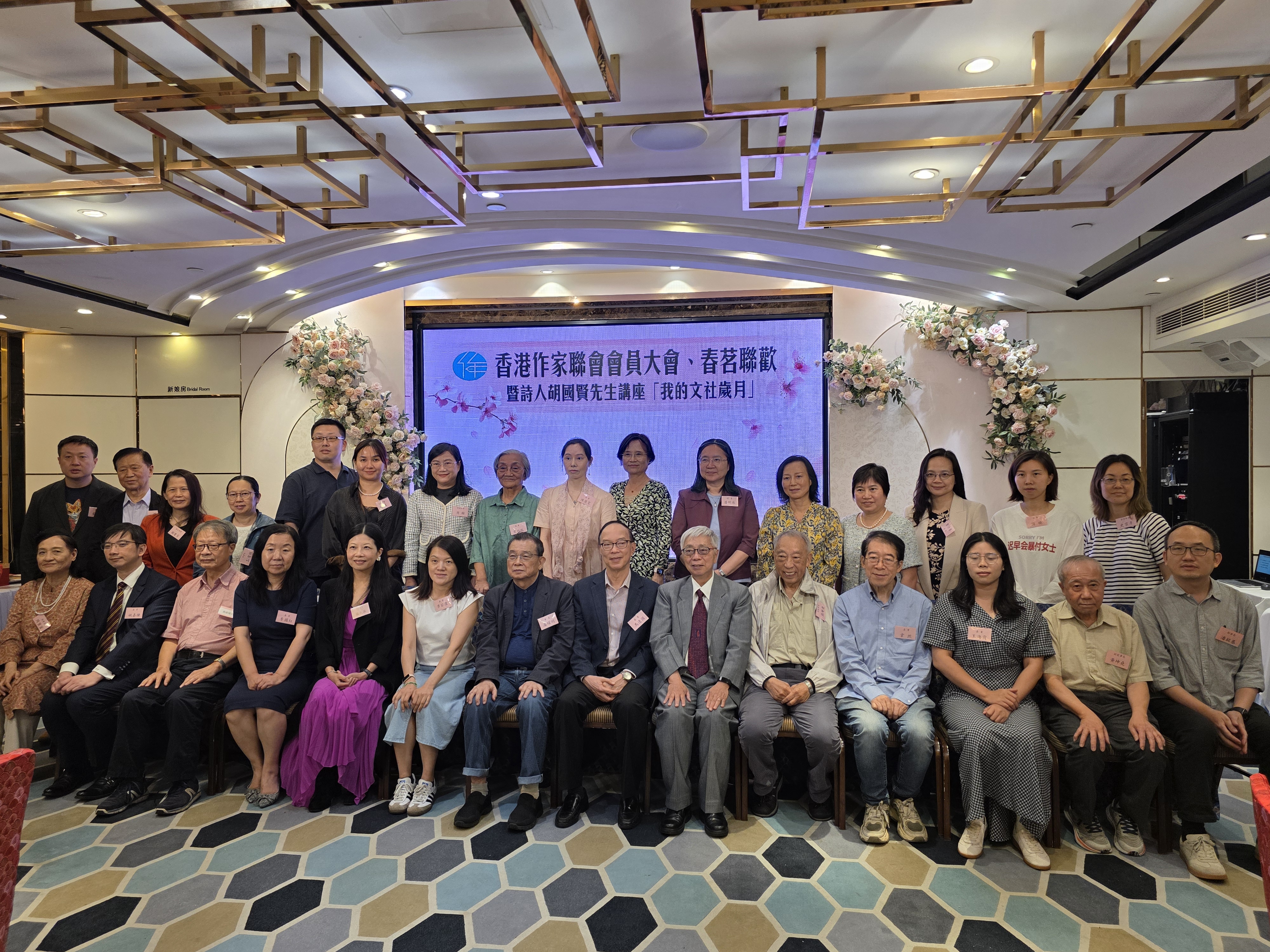 駿馬奔騰,萬象更新。香港作家聯會於二○二六年四月十一日晚假座炮台山彩福喜宴舉行會員大會暨春茗聯歡晚宴,並特邀著名詩人胡國賢擔任主講嘉賓,帶來「我的文社歲月」主題講座,當晚高朋滿座,來自文學、教育、出版、藝術及傳媒界的數百位名家與會員聚首一堂,在歡聲笑語中「以文會友」,共話香港文學的傳承與發展。
